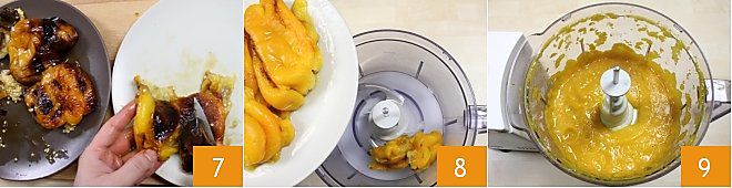 Prenez les poivrons et nettoyez-les : enlevez la tige, la peau et les graines en vous aidant d'un couteau 7. Une fois nettoyés, mettez les poivrons dans le mixeur 8 et mixez-les jusqu'à obtenir une crème homogène 9.