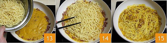 Lorsque les spaghettis sont al dente, égouttez-les en prenant soin de garder 1-2 louches d'eau de cuisson de côté 13. Faites sauter les spaghettis avec la sauce de poivrons et mortadelle directement dans la poêle, en allongeant avec 1-2 louches d'eau de cuisson et en cuisant à feu doux pendant quelques minutes pour bien mélanger le tout 14. Ajoutez un filet d'huile d'olive extra vierge et votre fausse carbonara est prête ! 15