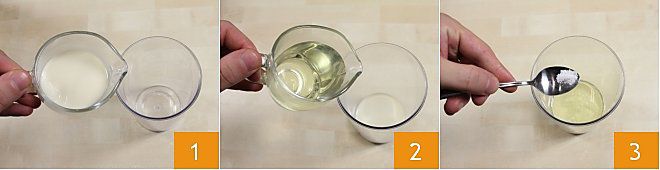 Pour préparer la fausse mayonnaise sans œufs, versez dans un verre haut (le verre en plastique du mixeur plongeant conviendra parfaitement) le lait de soja 2, l'huile de tournesol 2, ajoutez une pincée de sel 3 et