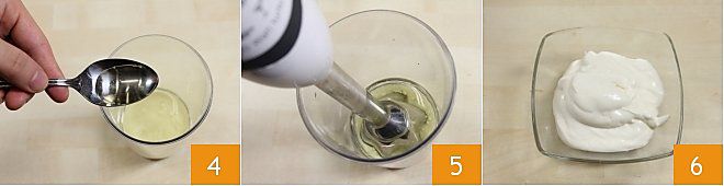enfin une cuillère de vinaigre 4 ou de citron. Plongez le mixeur plongeant dans le verre 5 et mixez les ingrédients à vitesse moyenne jusqu'à ce que le mélange épaississe ; cela prendra quelques secondes. Transférez la fausse mayonnaise sans œufs dans un petit bol 6 et servez-la à vos invités ! Rappelez-vous qu'en gardant les mêmes proportions, vous pouvez également utiliser du lait entier à la place du lait de soja et de l'huile d'olive à la place de l'huile de tournesol.