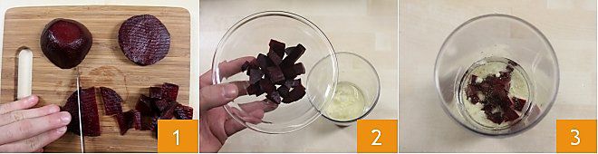 Pour préparer la fausse mayonnaise sans œufs avec la betterave, commencez par couper en morceaux la betterave précuite 1. Procédez comme précédemment, en versant dans un verre haut le lait de soja, l'huile de tournesol, une pincée de sel et enfin une cuillère de vinaigre ou de citron, puis ajoutez également la betterave coupée en morceaux (2-3).