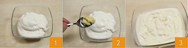 Pour préparer la fausse mayonnaise sans œufs avec la moutarde, procédez comme précédemment en préparant la mayonnaise vegan dans sa version de base et transférez-la dans un petit bol 1. Ajoutez la moutarde 2, mélangez les deux sauces et voilà votre fausse mayonnaise avec moutarde prête 3 !
