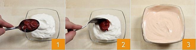 Pour préparer la fausse mayonnaise sans œufs avec tomate, procédez comme précédemment en préparant la mayonnaise vegan dans sa version de base et transférez-la dans un petit bol. Ajoutez alors le concentré de tomate 1, mélangez les deux sauces 2 et voilà votre fausse mayonnaise avec tomate prête 3 !