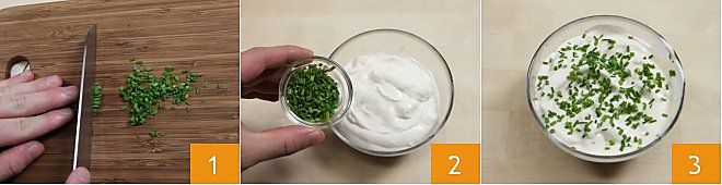 Pour préparer la fausse mayonnaise sans œufs avec ciboulette, commencez par hacher finement les brins de ciboulette 1. Procédez ensuite comme précédemment en préparant la fausse mayonnaise dans sa version de base et transférez-la dans un petit bol. Ajoutez alors la ciboulette hachée 2, mélangez et voilà votre fausse mayonnaise avec ciboulette prête 3 !