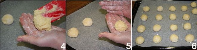 Farinez vos mains et prélevez, avec une cuillère ou une spatule 4, un peu de pâte avec laquelle vous formerez des boules de la taille d'une grosse noix (environ 25 g chacune)5 que vous déposerez sur une plaque recouverte de papier sulfurisé, en les espaçant de quelques centimètres les unes des autres. Procédez ainsi jusqu'à épuisement de la pâte (environ 28-30 boules)6.