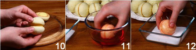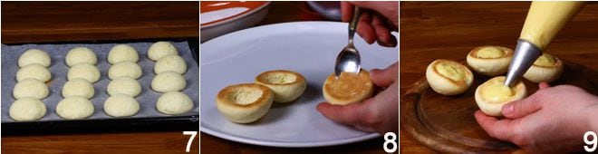 Enfournez les boules obtenues dans un four déjà chaud à 180°C pendant environ 15-20 minutes. La pâte, qui ne doit pas colorer en cuisant, 7 donnera naissance à environ 30 demi-sphères. Pendant ce temps, préparez la crème pâtissière (voir la recette en cliquant Crème pâtissière) et laissez-la refroidir. Lorsque les demi-sphères sont cuites, sortez-les du four et laissez-les refroidir, puis prenez une cuillère à café et creusez légèrement au centre de la partie plate de chaque pièce 8 pour obtenir une petite cavité. Mettez la crème dans une poche à douille avec une douille lisse et remplissez la petite cavité au centre de chaque demi-sphère 9;