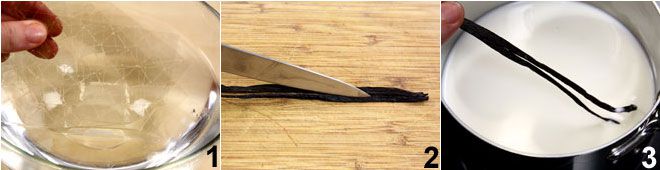 Pour préparer le flan à la vanille, commencez par mettre les feuilles de gélatine à ramollir dans un bol d'eau froide pendant 15 minutes 1. Incisez la gousse de vanille en deux 2 et récupérez les graines à l'aide d'un couteau; dans une casserole, versez le lait et la crème et ajoutez la gousse de vanille et les graines; mettez la casserole sur le feu et portez lentement les ingrédients à frôler l'ébullition 3.