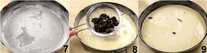 Beurrez un moule à gâteau d'un diamètre d'environ 26 cm 7 et versez-y la pâte. Ajoutez enfin les pruneaux 8 en les répartissant uniformément dans le moule 9. Enfournez le flan aux pruneaux (Far Breton) pendant 15 minutes à 240 degrés afin qu'une croûte couleur noisette se forme à la surface, puis baissez la température à 180°C et continuez la cuisson pendant environ 20/25 minutes jusqu'à ce qu'un cure-dent inséré à l'intérieur du gâteau en ressorte sec. Le flan aux pruneaux (Far Breton) est excellent consommé froid et peut éventuellement être garni de sucre glace.