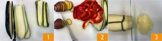 Pour préparer le flan de légumes au micro-ondes, commencez par couper les aubergines dans le sens de la longueur en tranches de 2 cm d'épaisseur 1. Coupez également le poivron en tranches, en retirant les graines et les filaments internes, et les pommes de terre en rondelles d'environ 1 cm d'épaisseur 2. Coupez aussi la provola en tranches régulières 3.