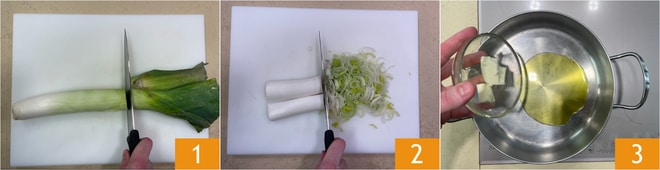Pour préparer le flan de poireaux avec sauce aux anchois, nettoyez les poireaux en coupant la partie verte la plus dure 1, puis tranchez-les 2. Dans une casserole, chauffez un filet d'huile avec une noix de beurre 3.