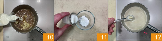 Ajoutez la crème fraîche 10 et faites cuire pendant 5 minutes. À part, délayez l'amidon dans le lait 11 et, lorsque la sauce commence à bouillir, retirez l'ail 12.