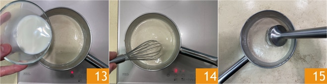 Ajoutez le mélange d'amidon et de lait 13 peu à peu, juste assez pour épaissir légèrement la sauce (il se peut que toute la quantité ne soit pas nécessaire) 14. Mixez avec un mixeur plongeant pour la rendre plus lisse 15.