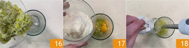 Récupérez les poireaux cuits, versez une quantité égale à 300 g dans un grand verre 16, ajoutez les œufs 17, le Parmigiano Reggiano râpé 17 et mixez pour amalgamer. Ensuite, ajoutez la crème et le lait 18.