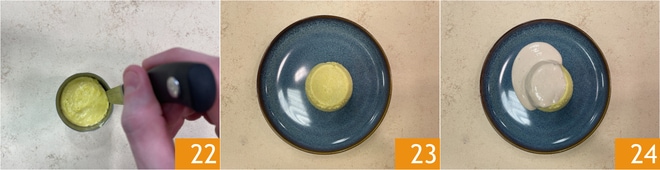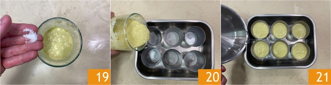 Salez le mélange 19. Beurrez 6 moules de 150 ml et placez-les dans un plat, versez le mélange 20 sans atteindre le bord 20. Versez de l'eau bouillante dans le plat pour couvrir la moitié des moules 21. Faites cuire dans un four préchauffé à chaleur statique à 160° pendant 35 minutes.