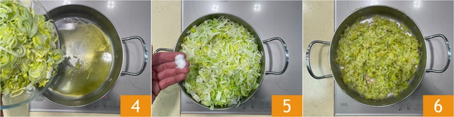 Ajoutez les poireaux tranchés 4, salez 5 et faites cuire à feu doux pendant 15-20 minutes 6.