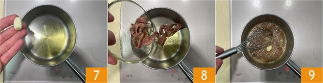 Pendant ce temps, préparez la sauce aux anchois : dans une petite casserole, versez un filet d'huile et une gousse d'ail 7, faites infuser à feu doux et dès que l'ail commence à crépiter, ajoutez les anchois 8. Mélangez avec un fouet et faites cuire à feu doux pour les faire fondre 9.