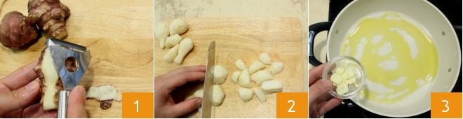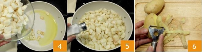 Pour préparer le flan de topinambour, vous pouvez commencer par nettoyer le tubercule : éliminez la peau extérieure avec un épluche-légumes 1, puis rincez-le sous l'eau courante et coupez-le en dés 2 ; à la fin, vous devrez obtenir environ 750 g de topinambour nettoyé. Dans une grande poêle, versez un filet d'huile et une gousse d'ail pelée et coupée en fines tranches 3.