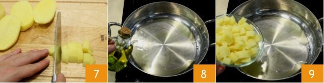 coupez-les en petits dés 7 pour accélérer la cuisson ; dans une grande casserole, versez l'huile 8 et ajoutez les pommes de terre 9.