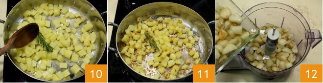 Ajoutez une branche de romarin 10, du sel et du poivre à votre goût et laissez cuire pendant 10 minutes. Remuez de temps en temps pour bien faire dorer les dés de pommes de terre, lorsqu'ils seront bien dorés, éteignez le feu 11. Dans un mixeur, versez le topinambour cuit 12.