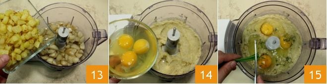 Ajoutez également les pommes de terre 13, puis mixez le tout. Ensuite, ajoutez les œufs 14 et la ciboulette en morceaux 15.