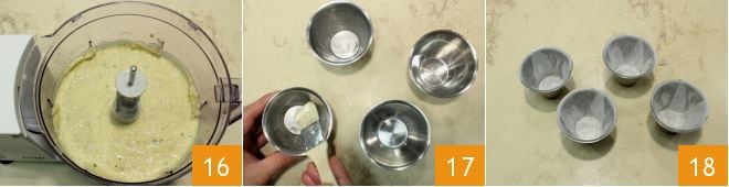 Faites fonctionner le mixeur jusqu'à obtenir une pâte homogène et crémeuse 16. Préparez ensuite les moules en aluminium d'une capacité de 125 ml, badigeonnez-les avec un peu d'huile 17 puis tapissez-les de papier sulfurisé : découpez un cercle pour le fond et des bandes pour le bord afin de couvrir entièrement les moules 18.