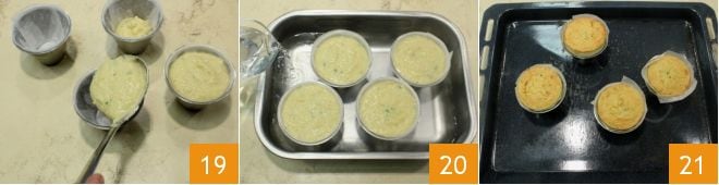 Puis, avec une louche, versez le mélange de topinambour et de pommes de terre dans chaque moule 19 en laissant un demi-centimètre du bord. Placez les moules dans un plat à bords hauts et versez de l'eau à hauteur de la base des flans 20. Faites cuire dans un four statique préchauffé à 180° pendant 40-45 minutes. Ensuite, sortez les flans du four, mettez-les sur une plaque et passez-les au grill pendant 5 minutes. Puis, retirez-les du four 21.