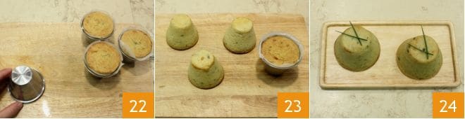 Sortez les flans de topinambour du four et laissez-les tiédir, puis démoulez-les en les retournant sur une planche à découper (22-23). Vous pouvez les servir en les décorant avec une branche de ciboulette 24 et les déguster tièdes ou même froids comme apéritif ou accompagnement savoureux !
