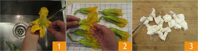 Pour préparer les fleurs de courgette farcies de burrata et de tomates séchées, commencez par laver délicatement les fleurs sous l'eau courante 1. Séchez-les toujours délicatement avec un chiffon. Lorsqu'elles sont sèches, retirez les excroissances en gardant la coupe inférieure, ouvrez délicatement la fleur pour repérer le pistil intérieur. Ensuite, extrayez le pistil avec les mains de chaque fleur 2. Réduisez en tranches la burrata 3.