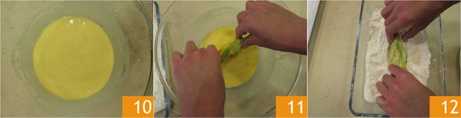 Vous devez obtenir une pâte lisse 10. Dans une grande casserole, chauffez l'huile jusqu'à ce qu'elle atteigne 170-180°, tandis que dans un bol, mettez suffisamment de farine pour fariner les fleurs. Puis immergez-les une à une dans la pâte à frire 11, égouttez-les de l'excès de pâte, passez-les dans la farine 12.