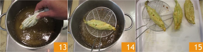 Plongez les fleurs dans l'huile chaude 13 et faites frire une à une les fleurs de courgette pendant quelques minutes jusqu'à ce qu'elles soient dorées et croustillantes; égouttez-les ensuite avec une écumoire lorsqu'elles sont dorées 14. Transférez-les sur un plateau recouvert de papier absorbant 15, salez-les à votre goût et servez-les très chaudes!