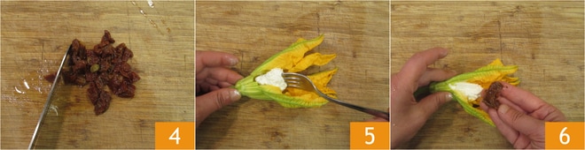 Égouttez les tomates et tamponnez-les avec du papier absorbant pour éliminer l'excès d'huile, puis coupez-les en petits morceaux 4. Commencez à farcir vos fleurs de courgette : écartez-les délicatement et insérez une tranche de burrata 5 et les tomates 6.