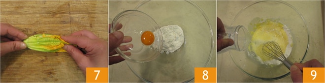 Prenez ensuite délicatement les feuilles avec les doigts pour fermer les fleurs. Effectuez une légère torsion des feuilles en les enroulant sur elles-mêmes 7 pour éviter que le remplissage ne s'échappe, et mettez de côté vos fleurs de courgette farcies. Pendant ce temps, préparez la pâte à frire : dans un bol, ajoutez la farine et le jaune d'œuf 8. Puis versez également l'eau gazeuse glacée, mélangez avec un fouet pour éviter la formation de grumeaux 9.