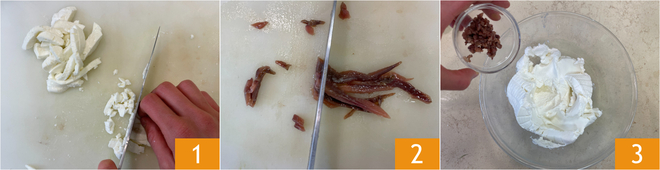 Pour préparer les fleurs de courgette farcies, commencez par la farce. Coupez la mozzarella en dés de 0,5 cm 1 et les anchois en petits morceaux 2. Dans un bol, mettez la ricotta et ajoutez les anchois 3.