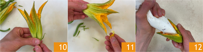 Nettoyez les fleurs de courgette, enlevez la tige, les petites feuilles 10 et le pistil 11. Remplissez les fleurs avec la farce 12, en laissant un peu d'espace pour pouvoir les refermer délicatement.