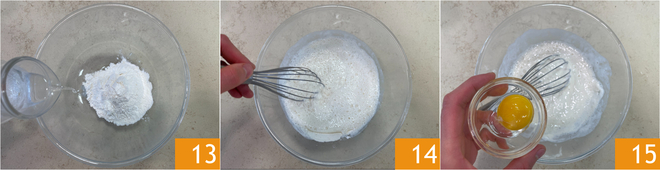 Préparez maintenant la pâte à frire en mettant la farine dans un bol. Ajoutez l'eau gazeuse 13 et mélangez vigoureusement pour éviter la formation de grumeaux 14. Ajoutez un jaune d'œuf 15.