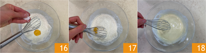 Ajoutez une pincée de sel 16 et mélangez 17 jusqu'à obtenir un mélange homogène 18.