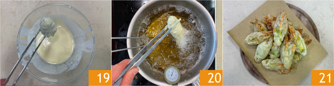 Plongez chaque fleur dans la pâte à frire, laissez égoutter brièvement 19, plongez dans l’huile de tournesol à 180°C et faites frire pendant 3-4 minutes 20, elles doivent être dorées et croustillantes. Au fur et à mesure que vous les cuisez, disposez-les sur du papier absorbant pour éliminer l'excès d'huile. Servez les fleurs de courgette en ajoutant une pincée de sel 21.