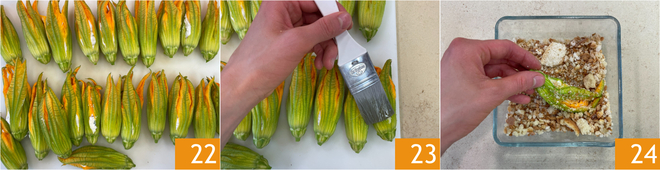 Une fois farcies 22, les fleurs peuvent aussi être cuites au four. Enduisez-les d’huile 23 puis passez-les dans la chapelure grossière 24.