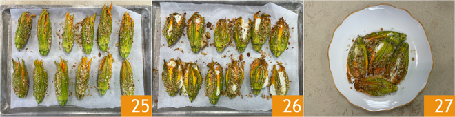 Disposez-les sur une plaque recouverte de papier sulfurisé 25 et faites cuire au four statique à 200°C pendant 20 minutes 26. Vos fleurs de courgette farcies sont prêtes à être servies 27.