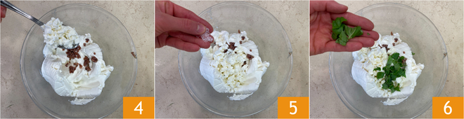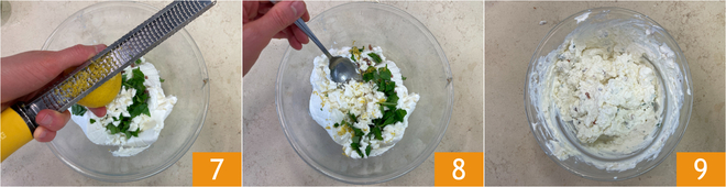 Continuez avec une pincée de zeste de citron 7 et mélangez soigneusement 8 jusqu'à obtenir un mélange homogène 9. Transférez le tout dans une poche à douille et réservez.