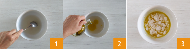 Pour préparer la focaccia avec pommes de terre facile et rapide, commencez par la pâte : dissolvez la levure dans un bol avec l'eau 1, puis versez l'huile 2 et mélangez. Enfin, ajoutez la farine en continuant de mélanger 3.