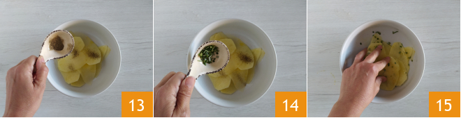 En attendant, épluchez les pommes de terre 10 et coupez-les en tranches fines à l'aide d'une mandoline ou d'un couteau 11. Mettez les tranches dans un bol et assaisonnez avec 15 g d'huile d'olive extra vierge 12.