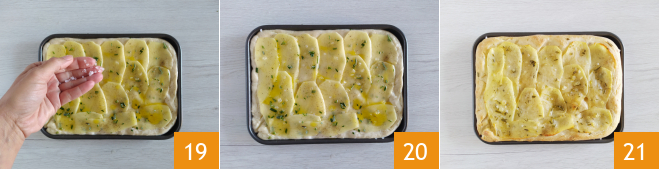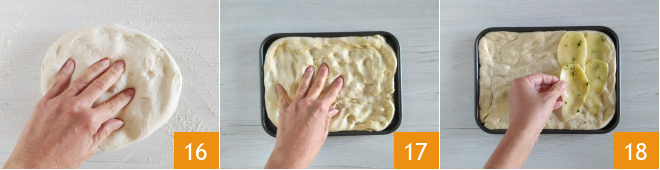 Une fois le temps de levée écoulé, travaillez rapidement la pâte sur le plan de travail fariné en l'écrasant avec les doigts 16. Transférez-la dans un moule de 25 x 20 cm huilé et étalez-la jusqu'à une épaisseur d'environ un demi-centimètre, en vous aidant de 5 g d'huile d'olive extra vierge versée sur la surface 17. À ce stade, disposez les tranches de pommes de terre sur la surface, en les chevauchant légèrement 18.
