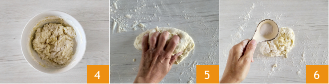 Quand elle commence à prendre consistance 4, renversez la pâte sur un plan de travail légèrement fariné et continuez à travailler 5. À ce stade, incorporez le sel 6.