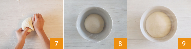Continuez à travailler jusqu'à ce que vous obteniez une pâte homogène 7. Transférez la boule dans un bol, couvrez avec du film plastique 8 et laissez reposer pendant 45 minutes, ou jusqu'à ce que le volume double, sous une couverture en laine 9.