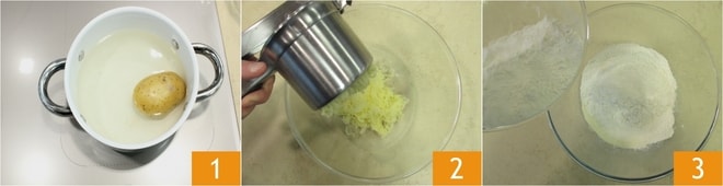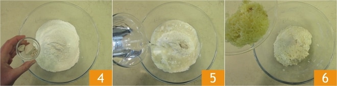 Ajoutez la levure fraîche émiettée 4, l'eau à température ambiante 5 et les pommes de terre écrasées 6.