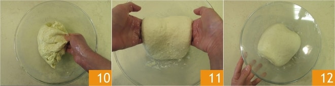 Travaillez la pâte jusqu'à ce que l'huile soit complètement absorbée 10, puis réalisez des plis de renforcement en soulevant la pâte avec vos mains 11 et en repliant les bords en dessous. Couvrez le bol avec du film plastique et laissez lever dans le four éteint avec la lumière allumée pendant environ 2 heures ou jusqu'au doublement du volume 12.