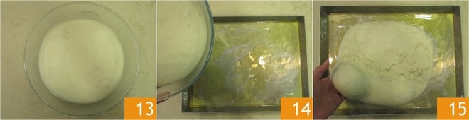 Après le temps de levée 13, huilez bien un moule de 30x40 cm. Renversez la pâte à l'intérieur 14 et étalez-la délicatement avec les mains pour couvrir toute la surface 15.