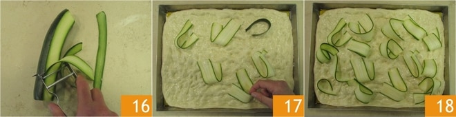 Lavez la courgette et à l'aide d'une mandoline, découpez des tranches fines d'environ 4 mm d'épaisseur 16. Disposez les courgettes sur la pâte 17 et laissez lever encore pendant 30 minutes à l'abri des courants d'air 18.