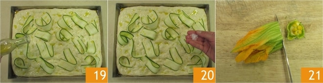 Après ce temps, assaisonnez la surface avec un filet d'huile 19 et saupoudrez de fleur de sel 20. Faites cuire dans un four statique préchauffé à 200°C sur la grille du milieu pendant environ 30 minutes. Pendant ce temps, lavez et préparez les fleurs de courgette, en les laissant entières 21.